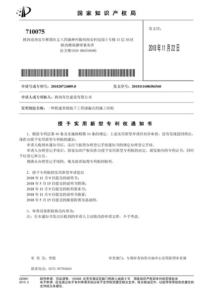 近日,由有色陜建申請的實用新型專利“一種快速查找地下工程滲漏點的施工結(jié)構”被國家知識產(chǎn)權局授權,專利號:201820724009.0。